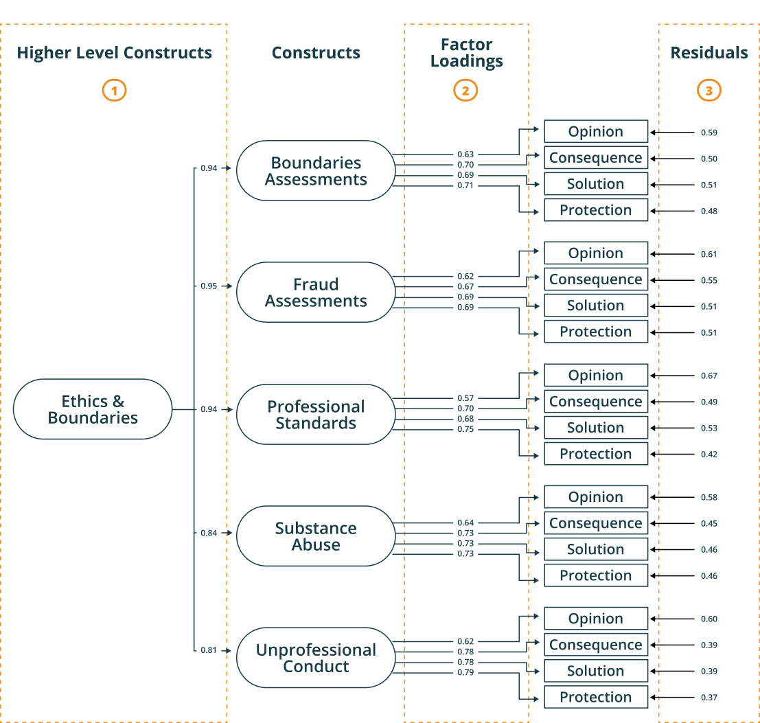 A confirmatory factor analysis tested whether the five domains stand independently while still forming one larger picture of ethical awareness. Results confirmed both: the test provides clarity within each domain and also captures an overall measure of ethical mindset.
